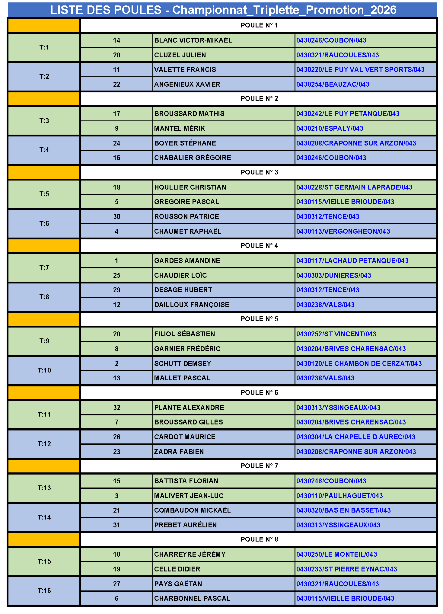 Le Championnat Départemental aura lieu le dimanche 22 Mars à Yssingeaux à 8h30. À l'issue de ce championnat, l'équipe vainqueur sera qualifiée pour le Championnat de France. L'équipe finaliste ainsi que l'équipe vainqueur de la petite finale seront qualifiées pour le Championnat Régional qui aura lieu à Aurec-sur-Loire le samedi 23 Mai 2026. Pour rappel, tous les joueurs devront être en tenue homogène club dès le début de la première partie sous peine de disqualification de l'équipe entière. Lors des qualificatifs et des championnats départementaux 2026, des contrôles d'alcoolémie seront effectués de façon aléatoire par un membre assermenté du CD 43. Tout joueur contrôlé positif sera disqualifié par le jury ce qui entrainera la disqualification de son équipe - visualiser ci-dessous la liste des joueurs qualifiés, le tirage des poules & le live direct des résultats![]() |