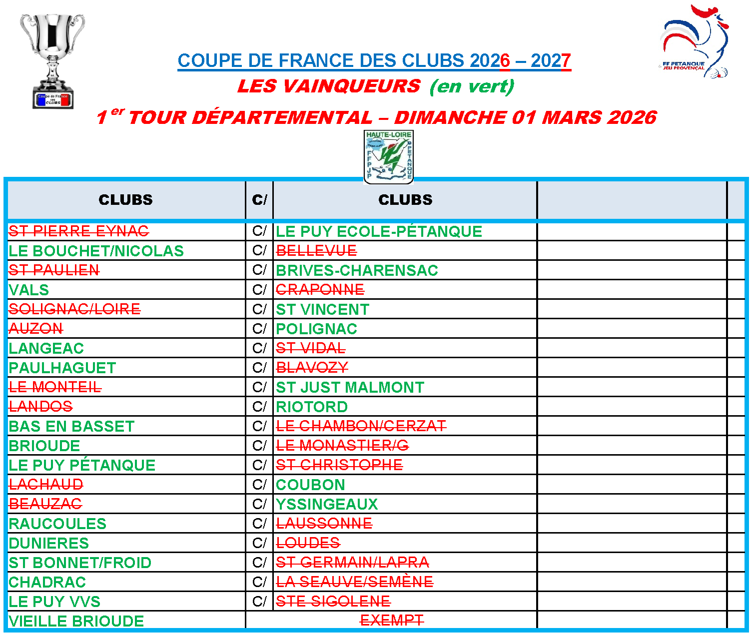 41 équipes se sont engagées dans la Coupe de France 2026-2027. Les rencontres ont eu lieu le dimanche 1er mars, à Espaly à la Halle des Orgues et à Yssingeaux. Les équipes vainqueurs sont en vert dans le tableau. Elles sont qualifiées pour le prochain tour qui se tiendra le 1er mai 2026 - clic sur la coupe pour voir les résultats...